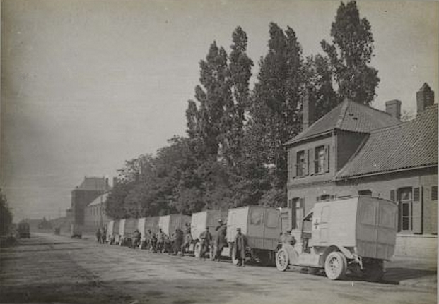 Ci dessous convoi d'ambulances, face à la place de l'église Ste Barbe.