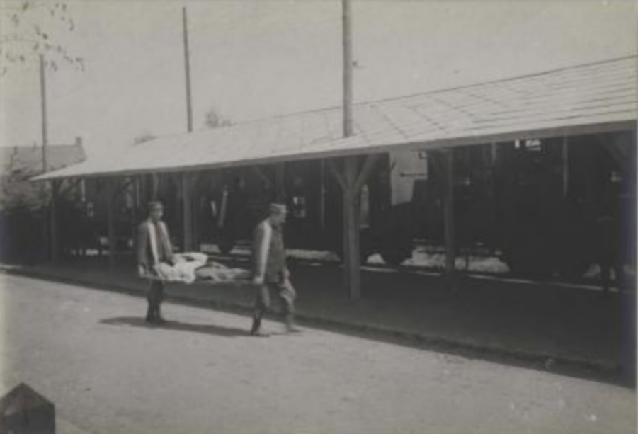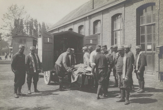 Les bléssés arrivent du front par train et par voiture ambulance ..