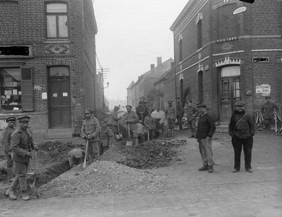 Des soldats portugais et britaniques enterrent une ligne de communication, rue des Normands.......