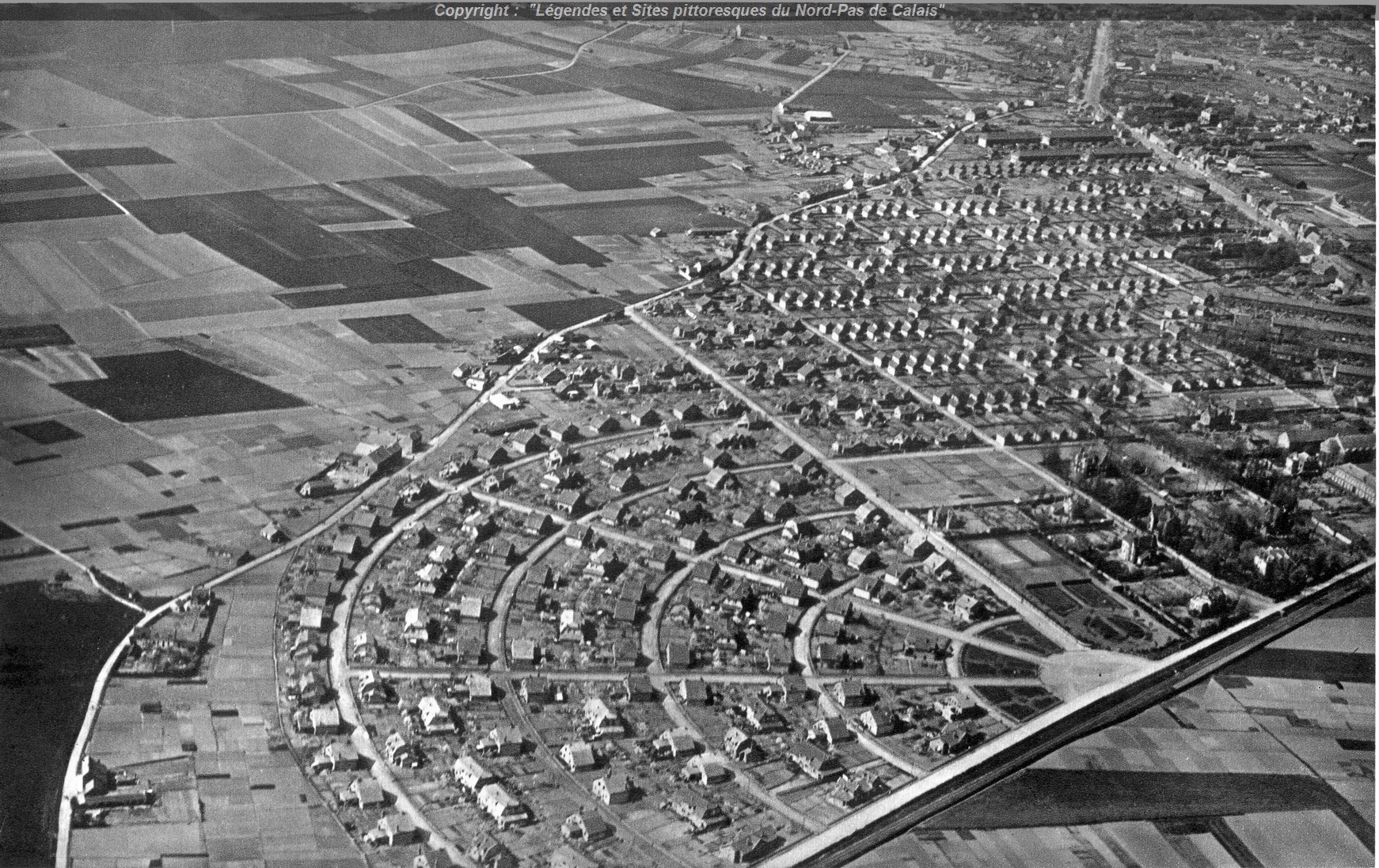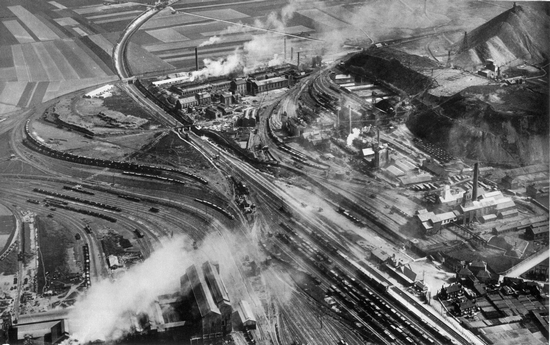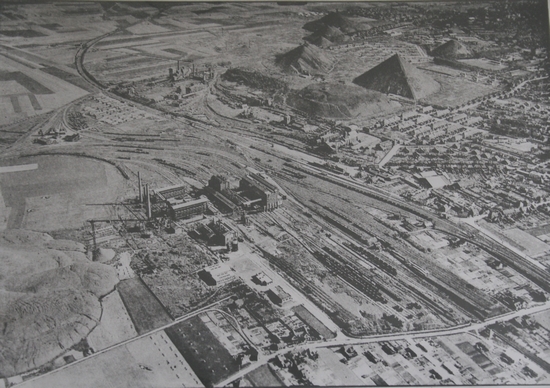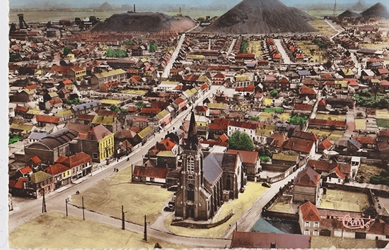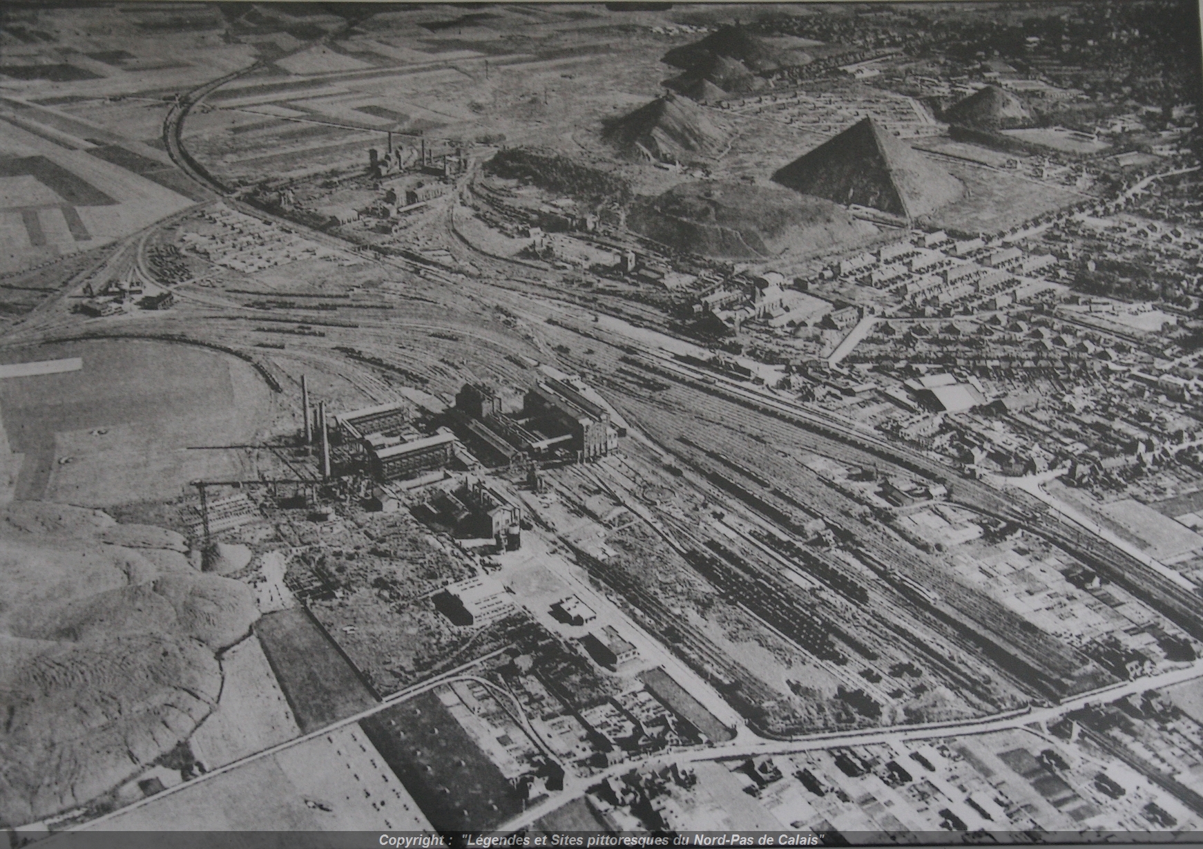 En bas à gauche: le terril de Labourse, au centre la cokerie, actuellement la zone industrielle n°1..... En haut à droite, les terrils de la fosse 3, actuellement Losinord ( lac et piste de ski) et centre commercial..(photo 1920 environ)