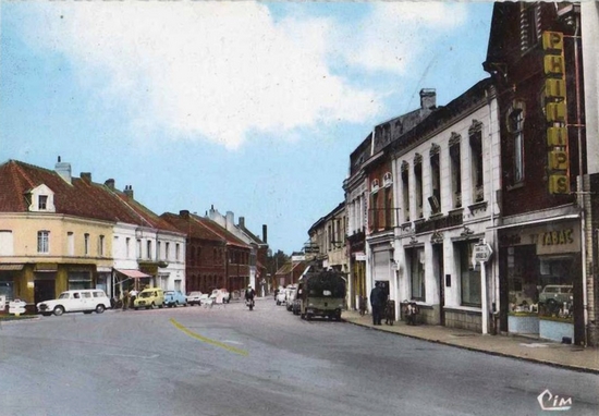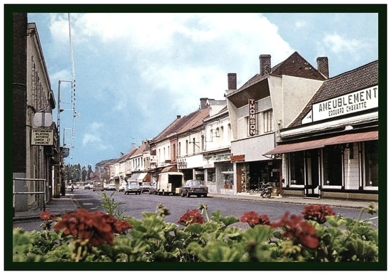 à gauche le "Cimena" , puis le marchand de chaussures Vatin, au centre les 2 portes du garage des pompiers .