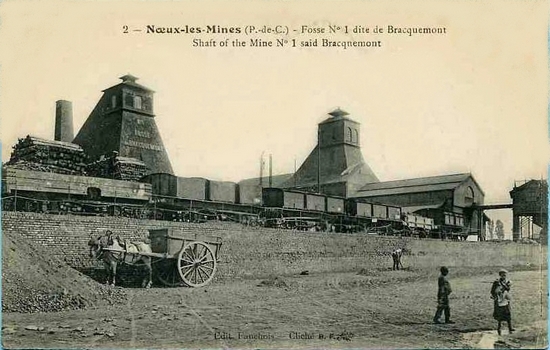 La Fosse 1 appartient à la compagnie des mines de Vicoignes (Valenciennes),dont elle prend le nom de son directeur , Aubé De Bracquemont . Le puit n°1 à gauche (ouvert en avril 1851,diam:4mètres, prof: 643mètres) et le 1Bis à droite ( aerage du puit n°1, prof:703mètres). photo vers 1905
